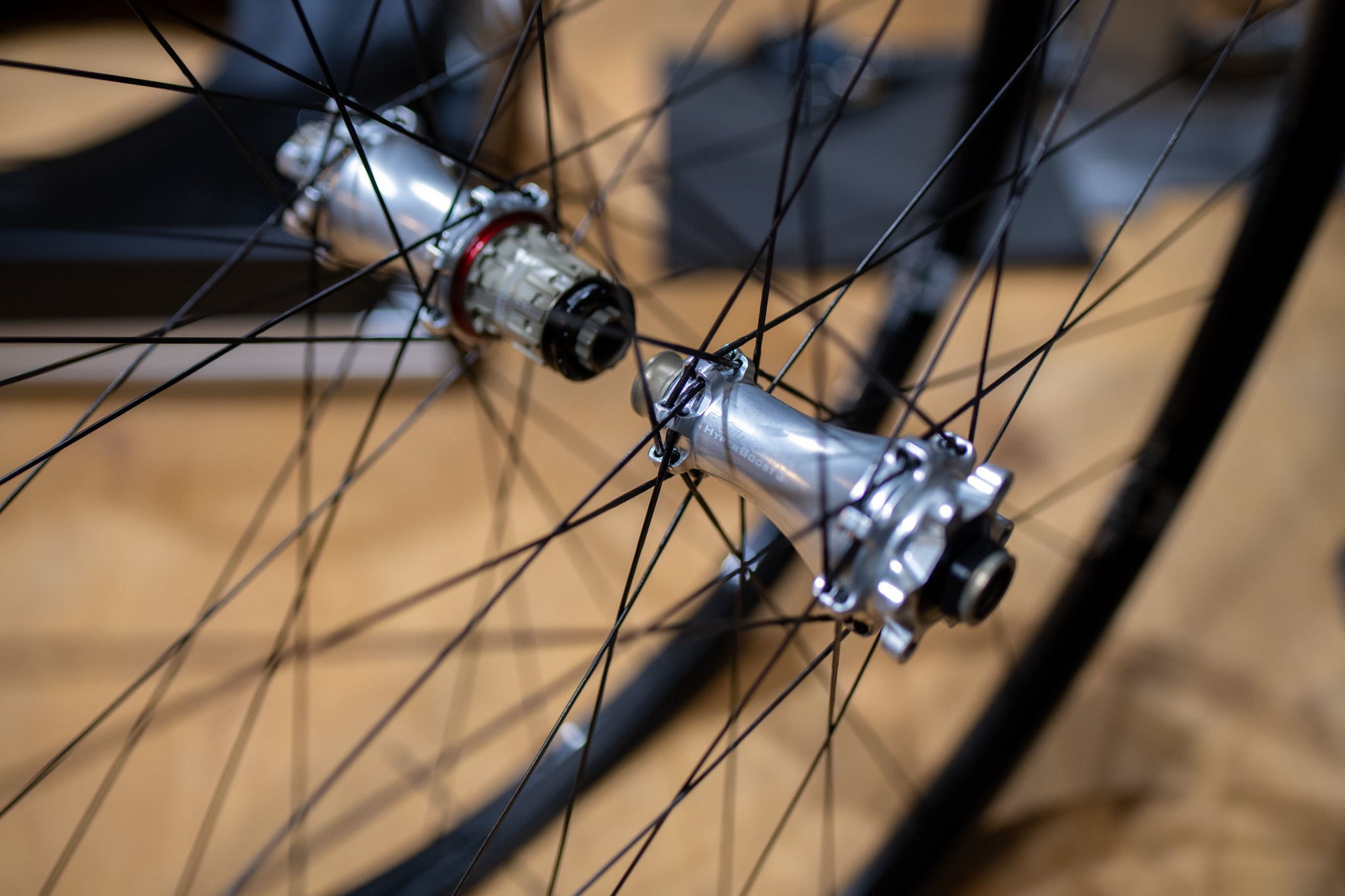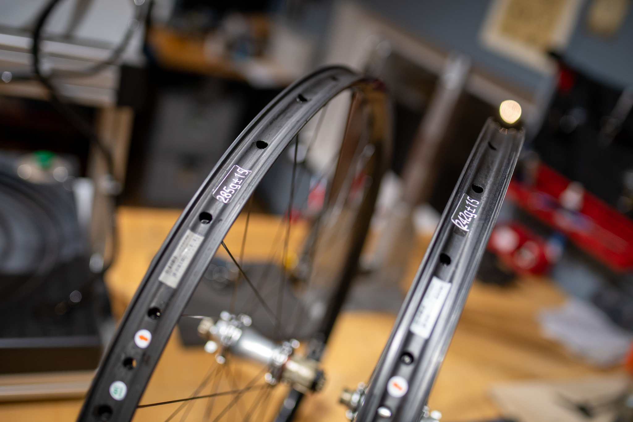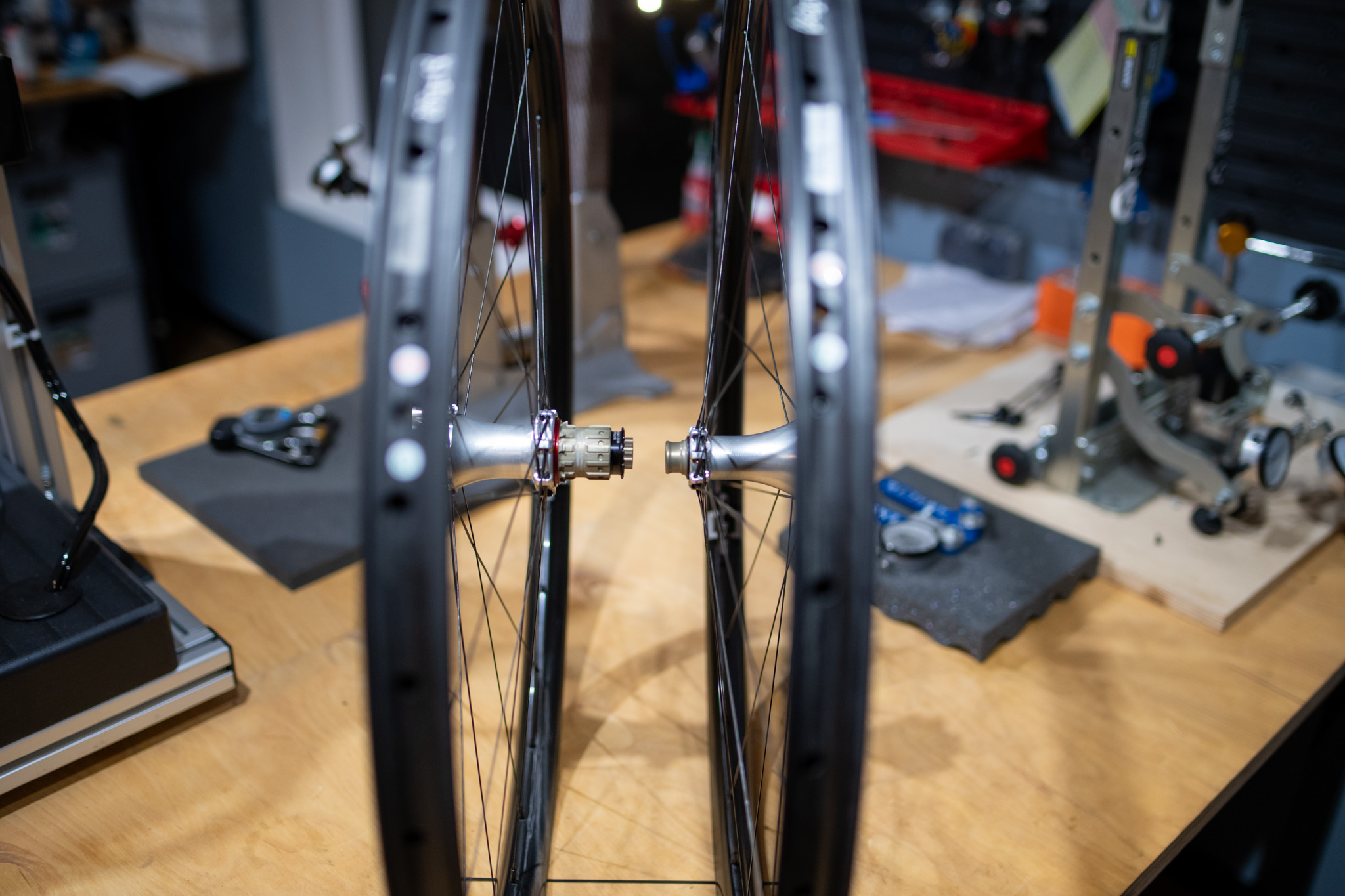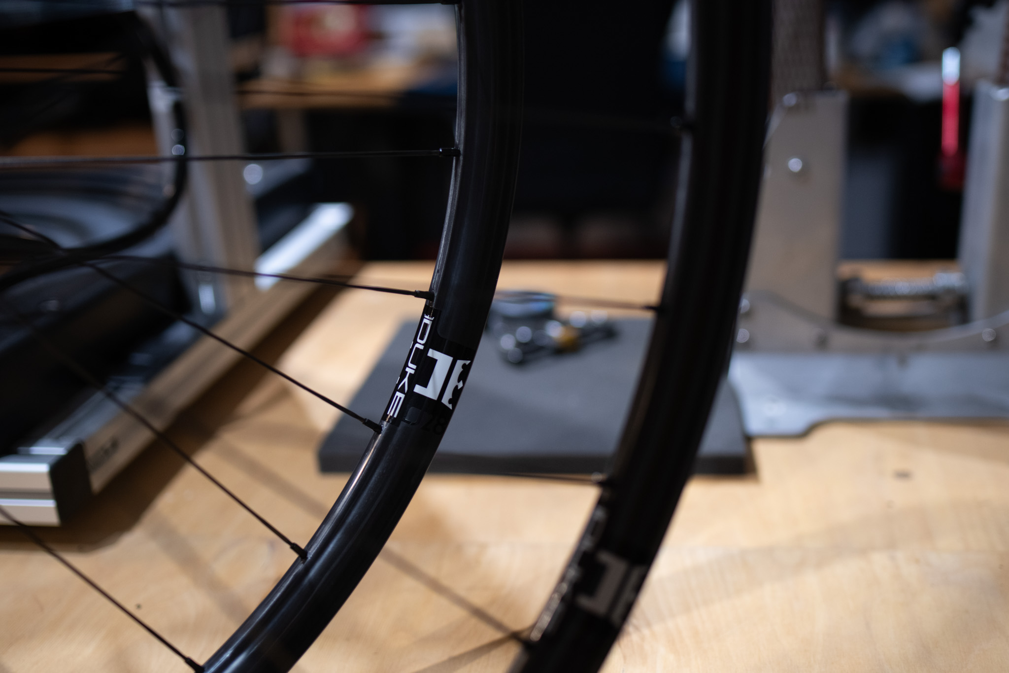 Koła powstały na obręczach Duke Lucky Jack SLS5 o szerokości wewnętrznej 31 mm, z piastami Extralite Boost oraz ultralekkimi szprychami Alpina Hyperlite. Każdy zestaw jest ręcznie zaplatany i centrowany w warsztacie CarbonOne.